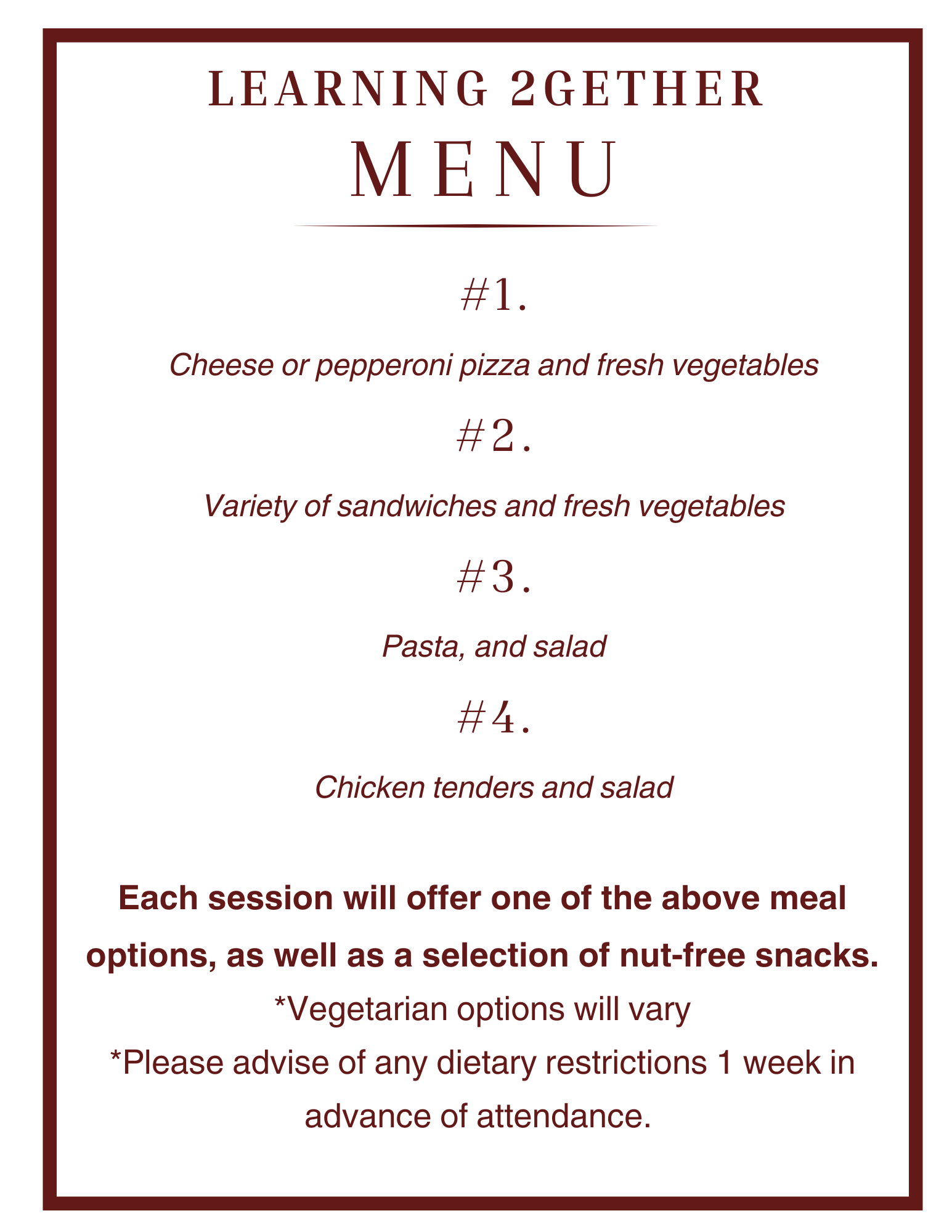 - Nut-free snacks and dinner available for all participants. See Menu Here